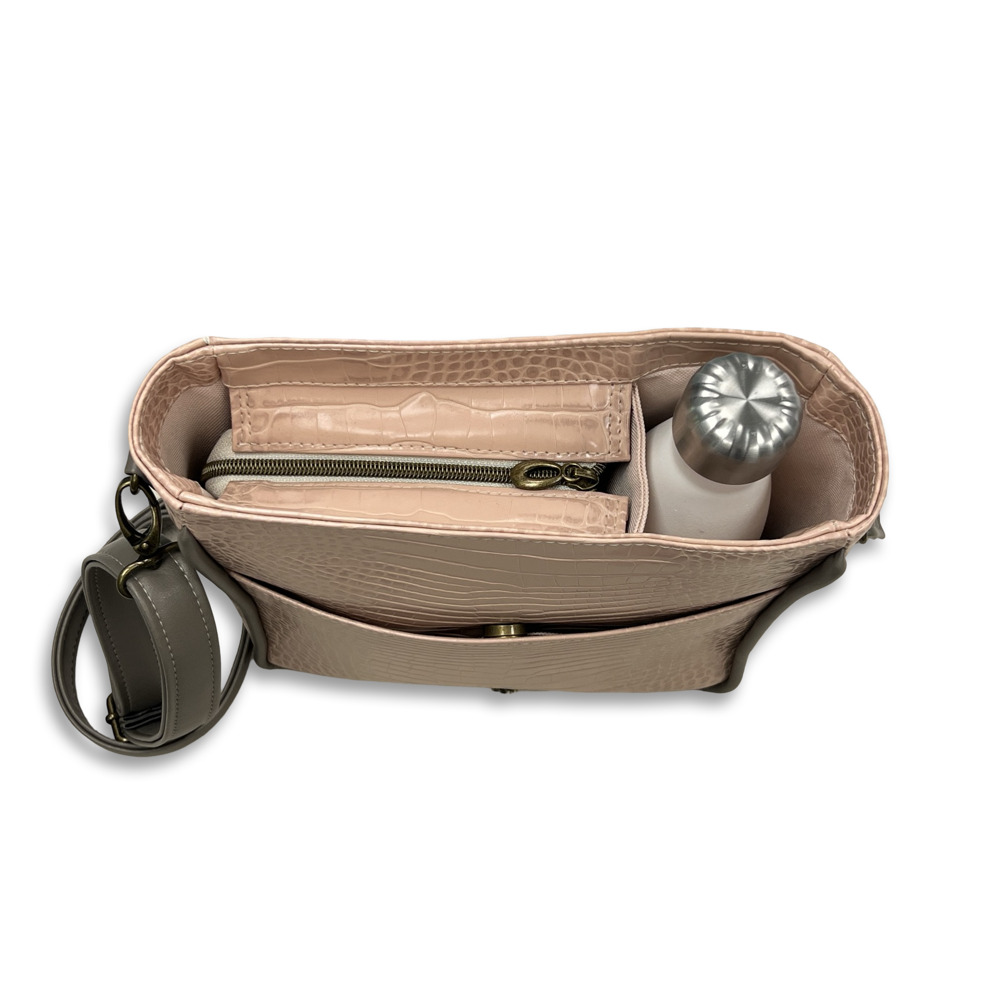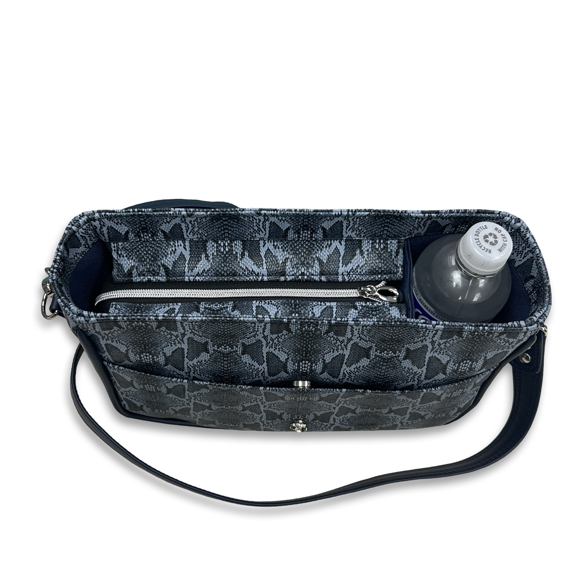 The divided water bottle compartment is designed to keep your beverages upright and easily accessible, no matter where you go. The Minnie fits a standard 16.9-oz plastic water bottle, while the Skinny can accommodate a taller metal water bottle.